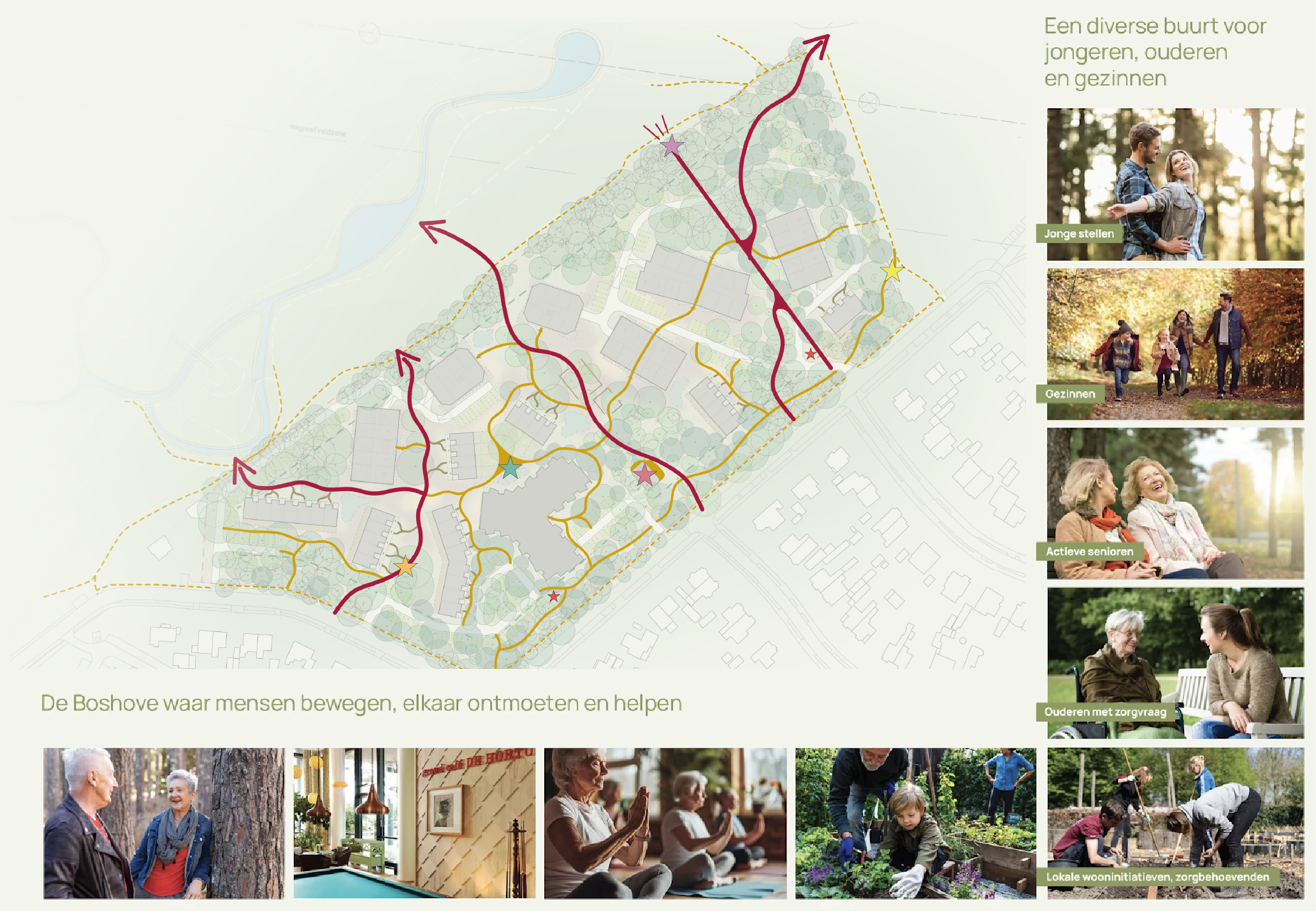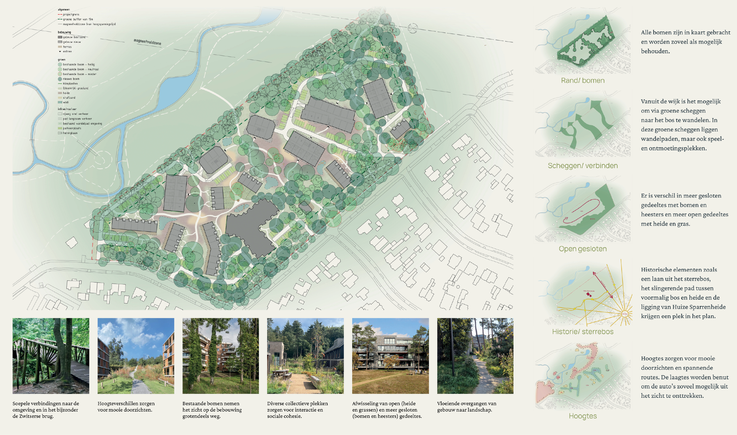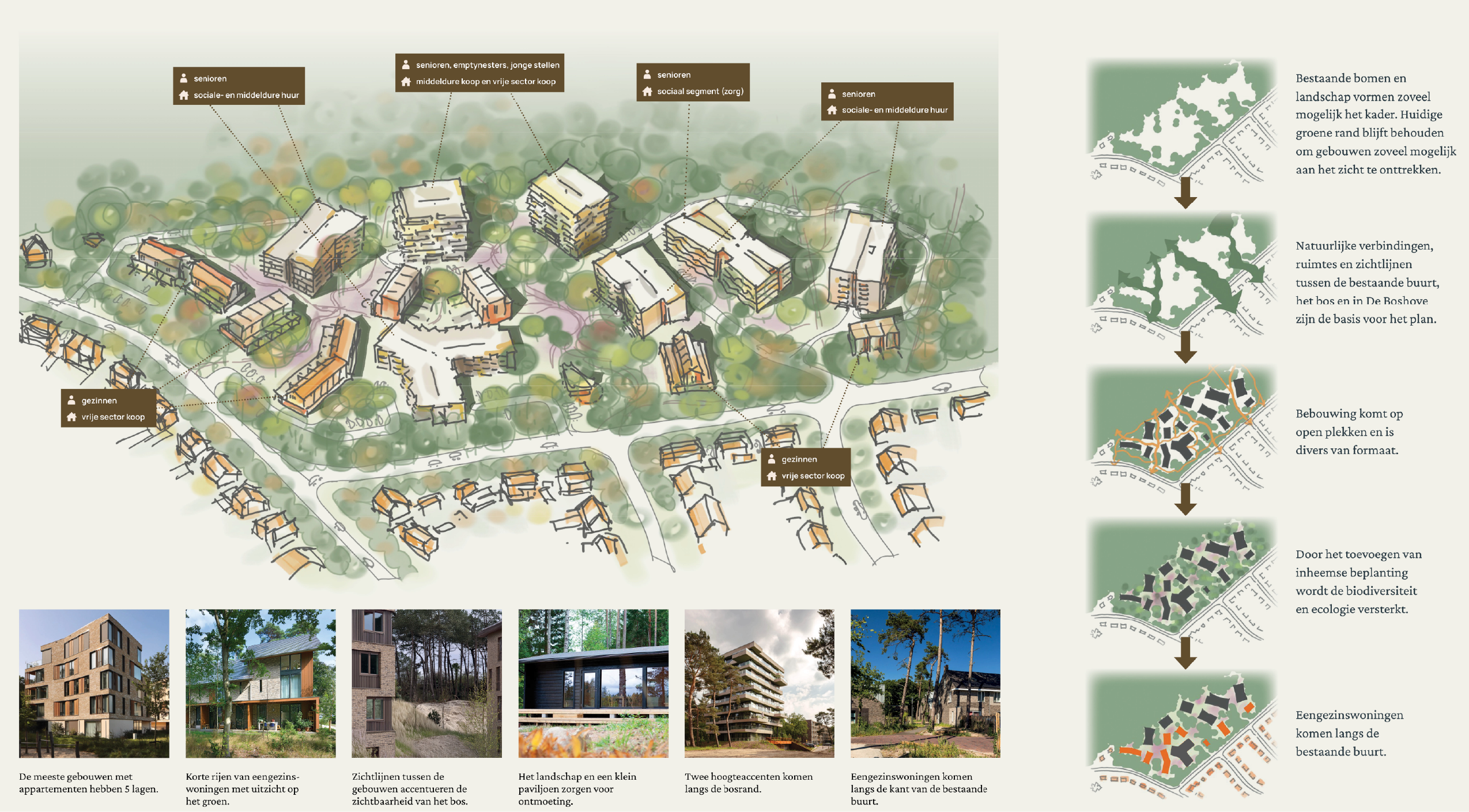 In het stedenbouwkundig concept vormen bestaande bomen en landschap (zoveel mogelijk) het kader. De huidige groene rand langs de Melvill van Carnbeelaan en de Nassau Odijcklaan blijft zoveel mogelijk behouden. Ook worden de mogelijkheden voor aanvullende groene beplanting en het aanplanten van jaarrond groene beplanting onderzocht. Natuurlijke verbindingen, ontmoeting en zichtlijnen tussen de bestaande buurt, het bos en De Boshove zijn de basis voor het plan. Door het toevoegen van inheemse beplanting worden de biodiversiteit en ecologie versterkt.